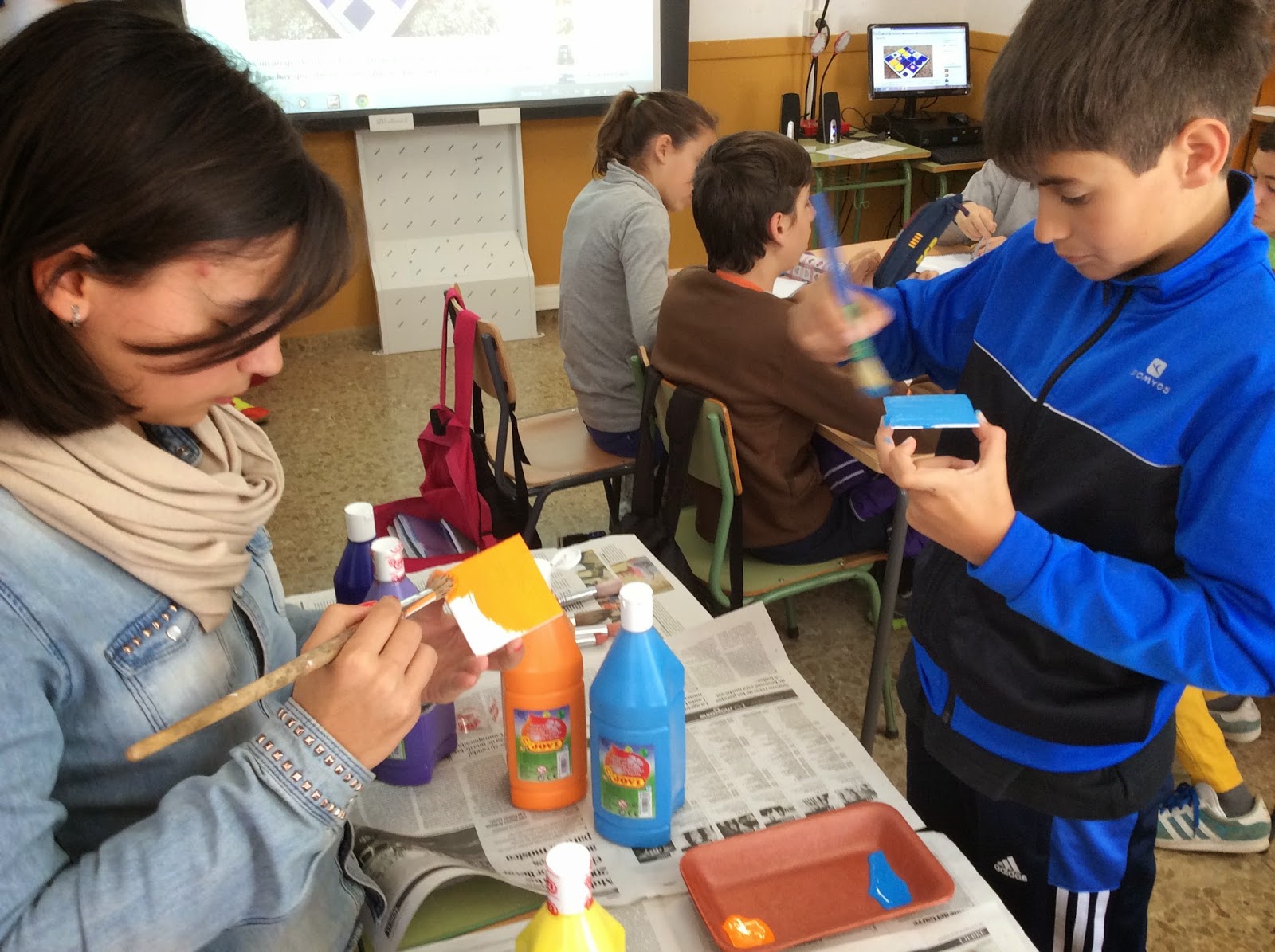 En primer lugar la competencia lingüística en todo lo relacionado con la preparación de las presentaciones a los compañeros, la social y ciudadana en la organización del grupo para desarrollar las tareas, o la digital en la utilización de las aplicaciones para la presentación o la edición de las imágenes, la artística en la investigación sobre la obra de Kandinsky o la realización de su propio cuadro y, por supuesto, la matemática, en el trabajo con la geometría.